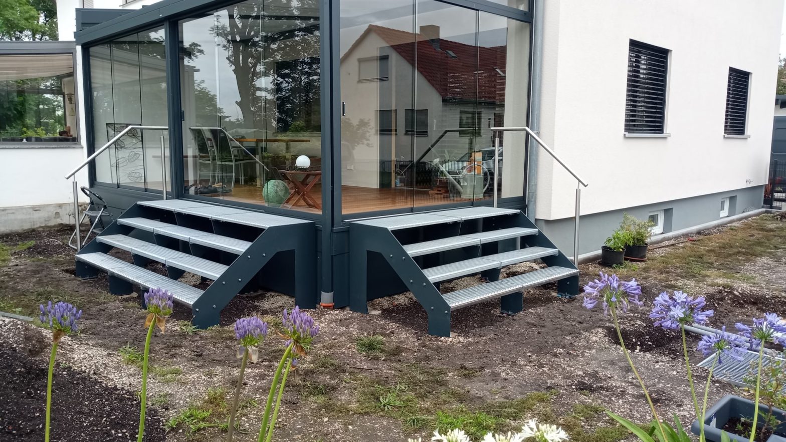 Aussentreppe für Wintergarten, mit Gitterroststufen MW 30/10. Verzinkt und Pulverbeschichtet in RAL7016 anthrazit, mit einseitigem Edelstahlhandlauf.